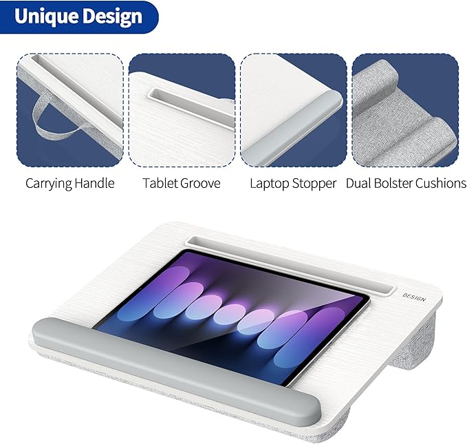Besign LT08 Laptop Stand, Portable Lap Desk with Pillow Cushion, Fits up to 14 inch Laptop, with Anti-Slip Strip for Desk, Sofa & Bed, White and Gray