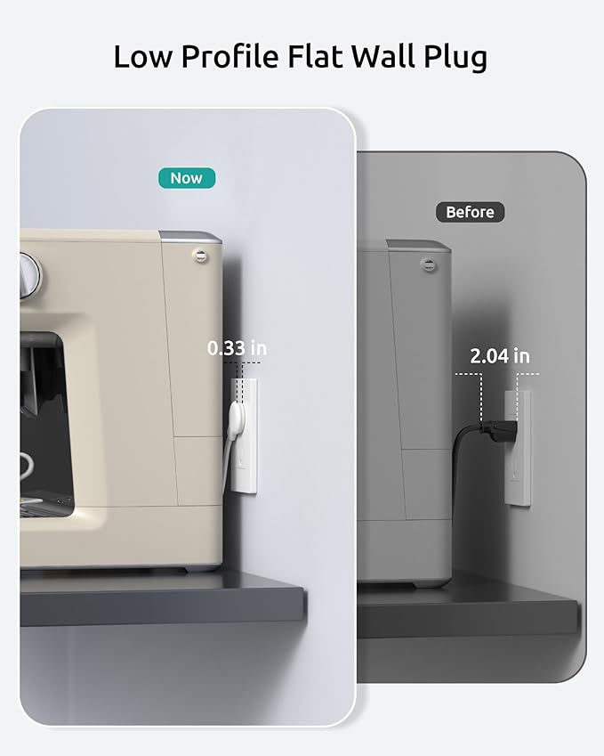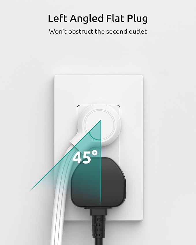 - Left Angled Flat Wall Plug: 0.33” thin low-profile flat plug lays flush against the wall, fits easily in tight spaces like behind bed, sofa, dresser, bookshelves, desks, keep furniture and media close to the wall. Angled plug keeps the extension cord from blocking the other outlet