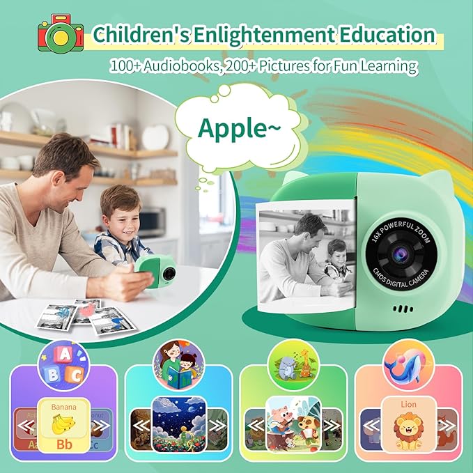 - The kids camera unique unicorn pattern design with advanced inkless printing technology, making it safe for children use. Instant camera for kids not just for a camera but it also has exciting educational features. It includes 26 English letters, 48 music songs, 100+ audio books, and 200+ cognitive pictures, fostering learning through play. More enjoyable and enducational.