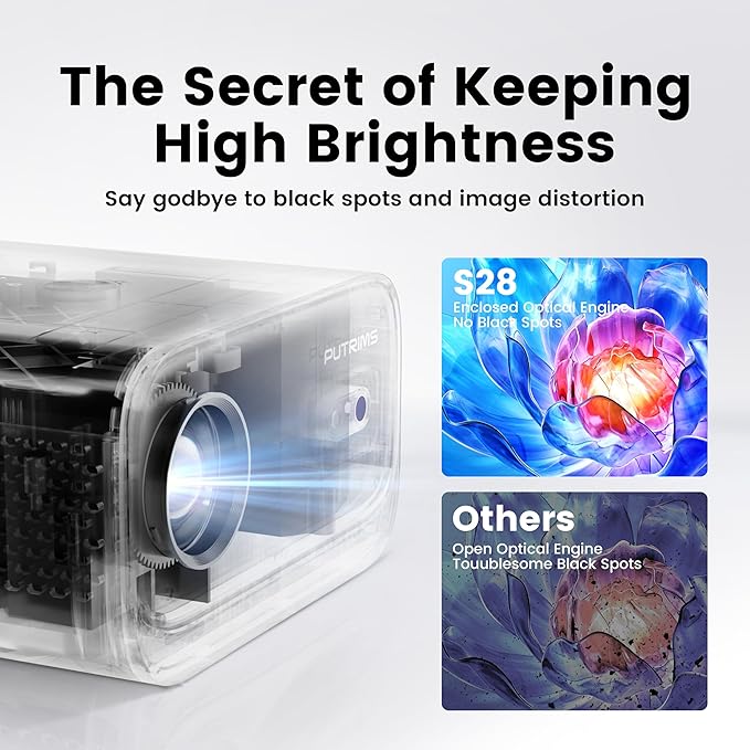 - 【3-Second Electric Focus &1.36:1 Short Throw Projector】PUTRIMS projector with wifi and bluetooth press the remote's F+/F- buttons to achieve 1080P sharpness in 3 seconds – It can be operated at a long distance compared to traditional manual focus. The 1.36:1 projection throw ratio saves 2.4 FT compared to other projectors to project a 200" screen. Switch between 4:3 and 16:9 at will, more viewing options