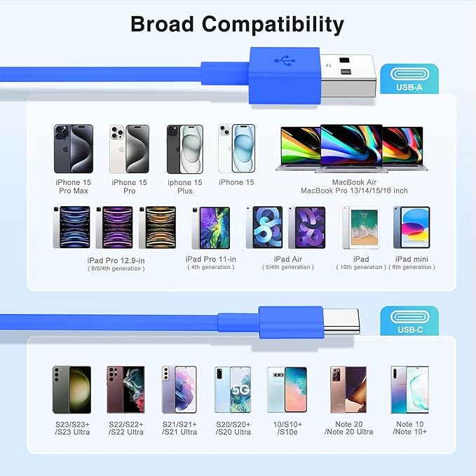 - 【Universal Compatibility】This USB A to USB C fast charging cable Compatible with iPhone 15 16/iPhone15 16Plus/iPhone15 16Pro/iPhone15 16Pro Max,MacBook Pro 13 inch, Macbook Air 13 /m1 Inch, MacBook 12 inch, iPad Pro 12.9/11 inch, iPad Air 4/5, iPad Mini 6, Google Pixel 6/6 Pro/5/5a, for Samsung Galaxy S24/S23/S22/S21/S20/S20+/S20 Ultra, Galaxy A53/A73/A71,Galaxy Note 10/10+/20 Ultra, Switch, PS5 and other USB-C port devices.