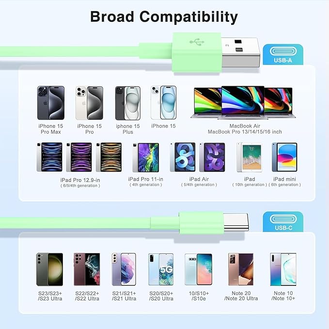 - 【Universal Compatibility】This USB A to USB C fast charging cable Compatible with for iPhone Air 17 16e 16 15 Pro Plus Pro Max,for iPad Pro, for iPad Air, for iPad Mini ,for MacBook Pro, for Macbook Air , for Galaxy S25/24/S23/S22/S21, for Galaxy A56/A55/A54/A53,for Galaxy Z Flip7 FE, for Galaxy Z Fold7/6/5,for Galaxy Z Flip7/6/5,for Galaxy W25/W24/W23, for Google Pixel 10/9/8/7/6/5/4/3,for Switch, for PS5 and other USB-C port devices.