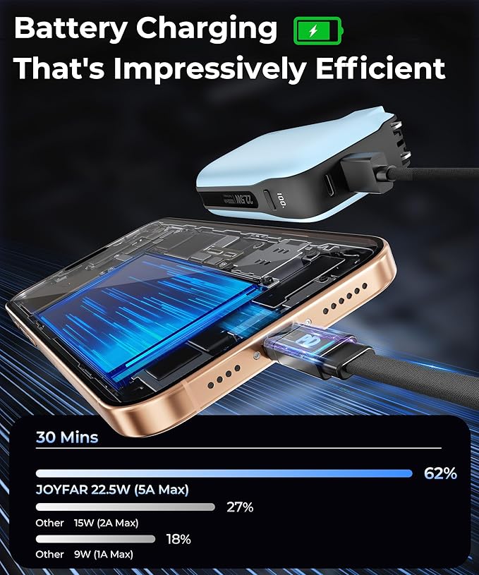 - Safe Charging: Joyfar’s USB-C power bank uses premium materials and holds UL, FCC, RoHS, UN, TUV, MSDS, etc., certifications. It also features a 15-Layer Smart Protect system to block unusual charging from the start, while its smart tech cuts overheating risk by 97% - no worries about overheating or device damage