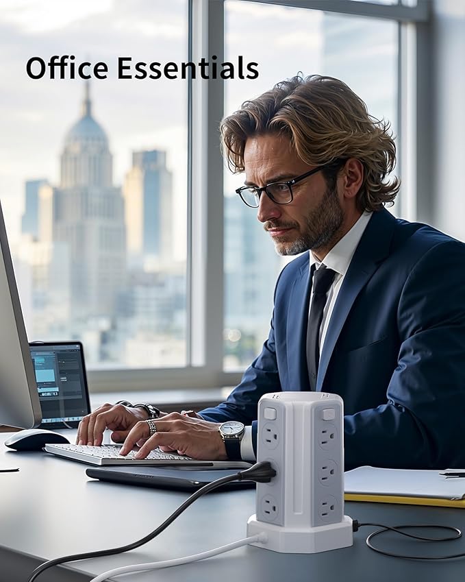 - 【Ultimate Charging Hub: USB Power Strip + 12 AC Outlets】 Power your entire workstation with this USB power strip’s 16-in-1 capacity: 12 widely spaced outlets (4-side tower design) handle large adapters, while 15W USB-C and 12W USB-A ports fast-charge phones, tablets, and gadgets. The surge protector with USB ports outperforms traditional extension cords for tech-heavy setups.