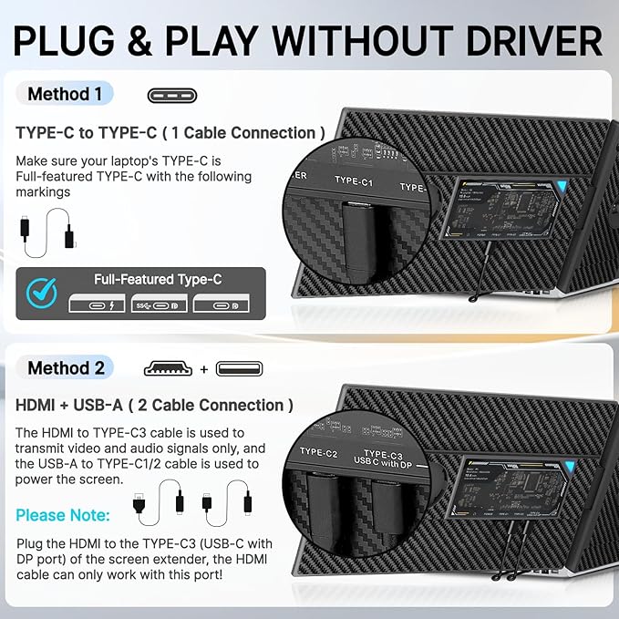 - 【Plug & Play—No Drivers Needed】Enjoy a hassle-free setup with this plug-and-play dual screen extender. It comes with all the necessary cables: 1 Type-C to to Type-C Cable, 1 HDMI to Type-C Cable, and 1 USB-A to Type-C Cable. Simply connect the device via Type-C or HDMI along with USB-A—no additional drivers required. Note: When using HDMI to Type-C, plug it into Type-C3 (marked as 'USB-C with DP'connect the included USB-A to Type-C1/C2 cable to power the screen extender.