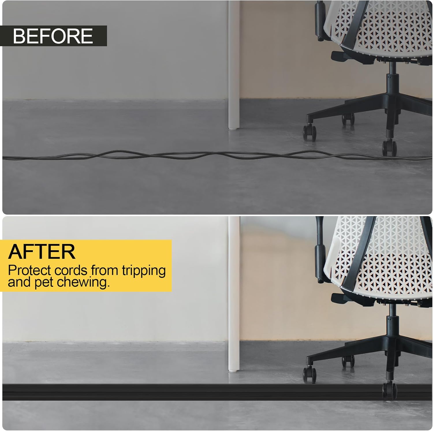 - 【Protection of Cords】Floor cord cover for wires can efficiently hide and protect cords. Prevent accidental tripping caused by cables dragging. Prevent cables from being crushed and stepped on, reduce damage and extend cables usage time. Tips: Due to tight packaging, if you feel that cord cover is not flat enough, you can first press it with heavy object before use