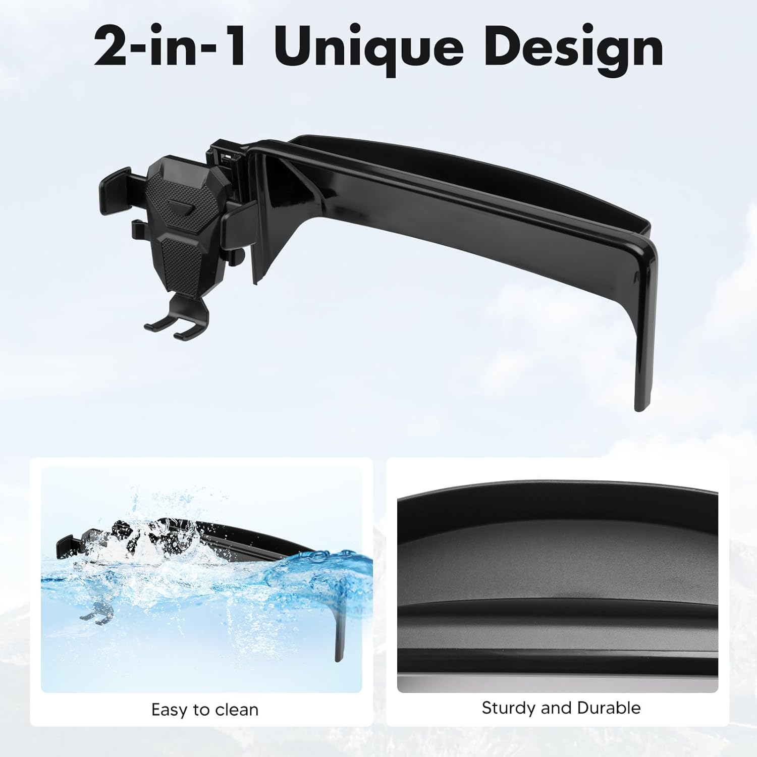 - 2-in-1 Unique Design:Dashboard storage tray could increase storage space and store small items, such as sunglasses, coins, keys, cards ,etc. Help you find the small thing quickly and keep you car tidy. Besides, dashboard storage tray equipped with cell phone holder which could holds your phone perfectly even on really rough roads or sudden stops.