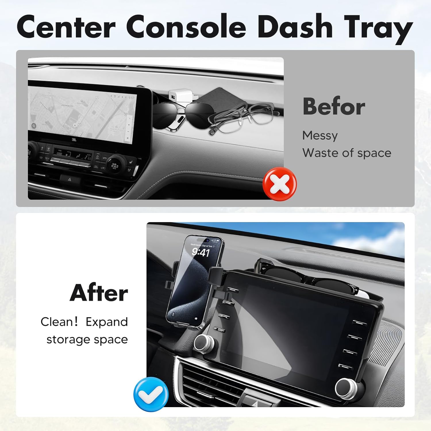 - Easy Installation: Just stuck the dashboard tray directly behind the screen.The dashboard center console organizer will stay in place. About the phone mount, loosen the screw and push the phone holder onto the ball joint. Finally tighten the screw.