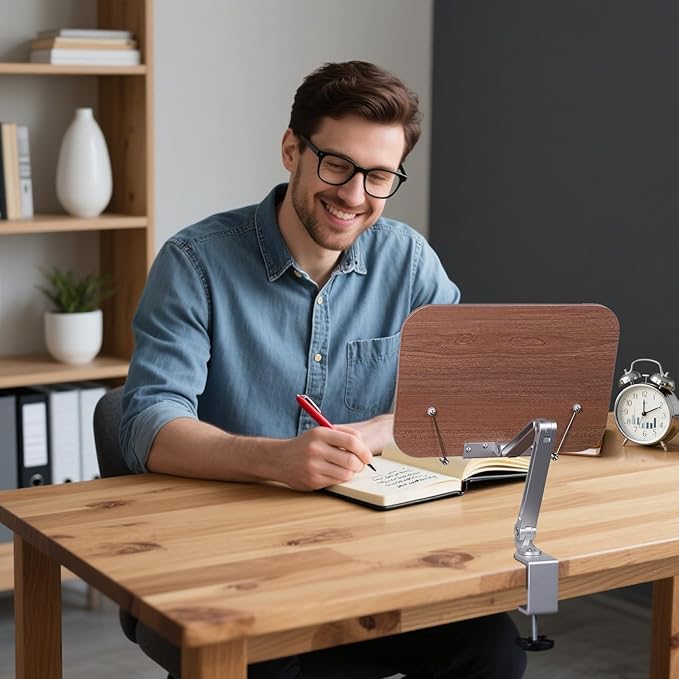 ASIEIT Book Stand for Reading, Wood Desk Clamp Book Holder, Cookbook Stand for Kitchen, Recipe Book Stand with Clamp, Height and Angle Adjustable, Foldable and Portable for Office, Bible, Recipe