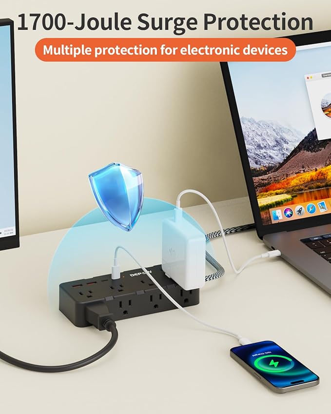 - 【1700J Surge Protection】: Equipped with 1700 joules surge protection, this power strip safeguards your electronics from lightning strikes and power surges, Even if you forget to unplug it when you're out and about, you'll have peace of mind.