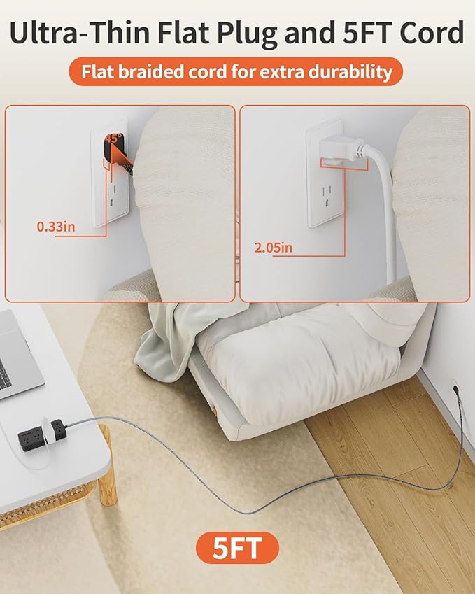 - 【Ultra Thin Flat Plug】: The 0.33in ultra-thin flat plug design allows you to easily plug in this power strip even behind furniture or in tight spaces, while the 5FT braided cord provides added durability and flexibilit.