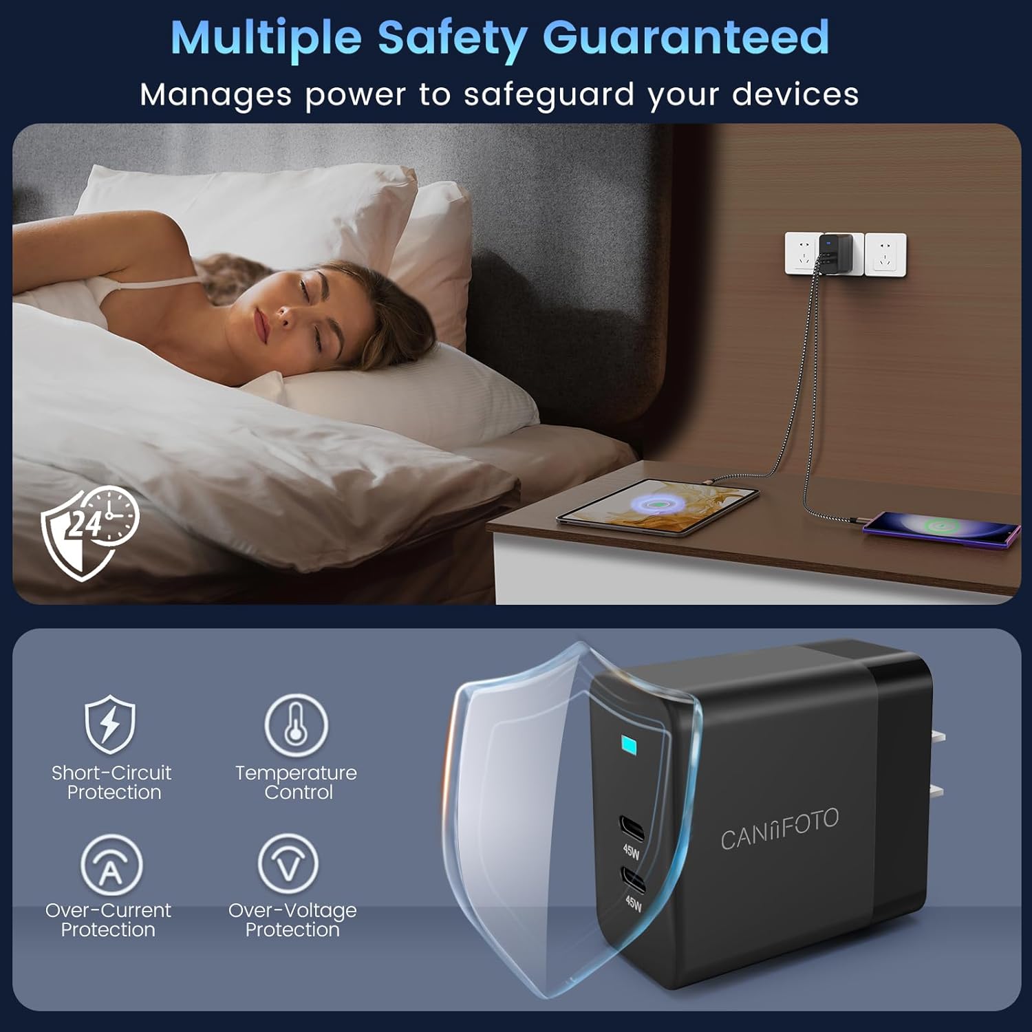 - ă45W Super Fast Charger 2.0ă: Equipped with 2X 45W PPS/PD3.0 USB-C port, 2-port 45w USB-C charger support Super Fast Charging 2.0 to provide compatible devices with maximum power of 45W. For Samsung fast charger type c can provide full-speed charge up to 50% within 20min for new S24 Ultra, full charge from 0% takes less than 1h, allowing you to power up your galaxy phone series at unprecedented speeds. Say goodbye to long waiting times and hello to instant power!