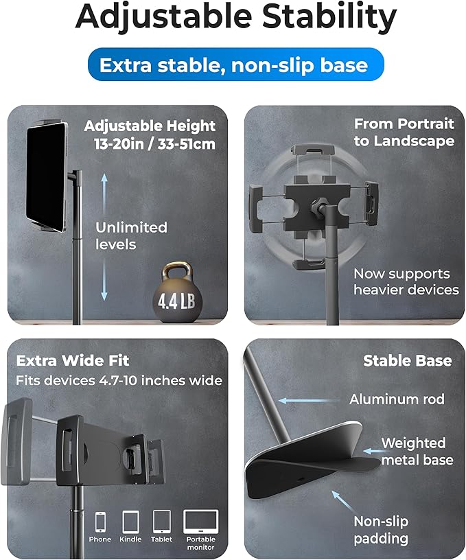 - ROCK-SOLID PORTABLE MONITOR STAND: This Tablet Stand for Desk supports everything from iPad mini to Ipad Pro 13-inch to heavier 17-inch portable monitors up to 4.4 lbs; this Stand for Ipad has reinforced silicone-padded clamp