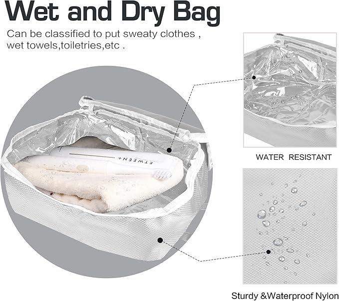 - DRY AND WET SEPARATION DESIGN: We have designed a medium size waterproof storage bag in the packaged travel bag, which can store some clothes that have not been dried to keep your suitcase clean.