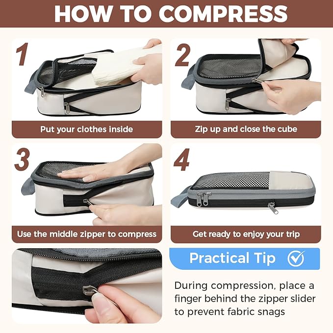 - HOW TO MAKE THE COMPRESSION HAPPEN? - There Is a Extra Zipper Outside Of Our Compression Packing Cubes Which Can Be Zipped Up To Flatten The Cubes And Save The Space As Far As Possible. It Just Works Like a Vacuum Sealer. You Just Need To :1) Fold Your Clothes And Flatten Them 2)Pack Clothes In The Cubes And Zip The Normal Zipper. 3)Put A Finger On The Back Of The Zipper In The Space When Compressing The Packing Cubes In Case The Zipper Get Stuck In Fabric.