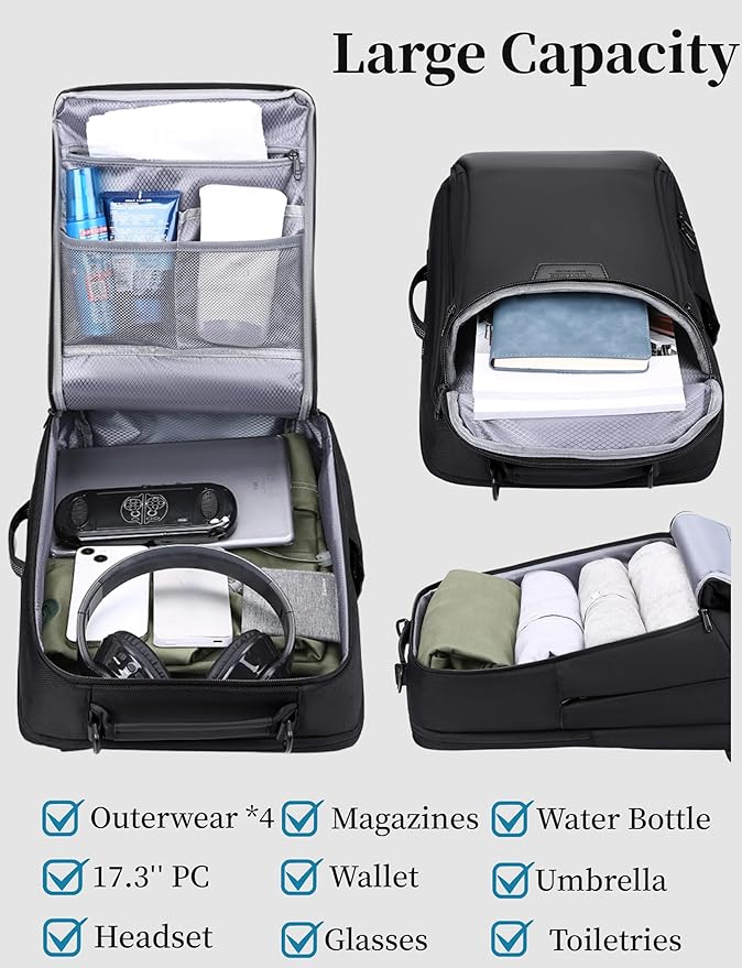 - Large Capacity: This travel carry on backpack is about 9.5’’(L)*6.6’’(D)*16.8’’(H), weight about 2.8lbs. It features a large main compartment with a dedicated laptop compartment, and several other pockets and compartments for quick access to your essentials.