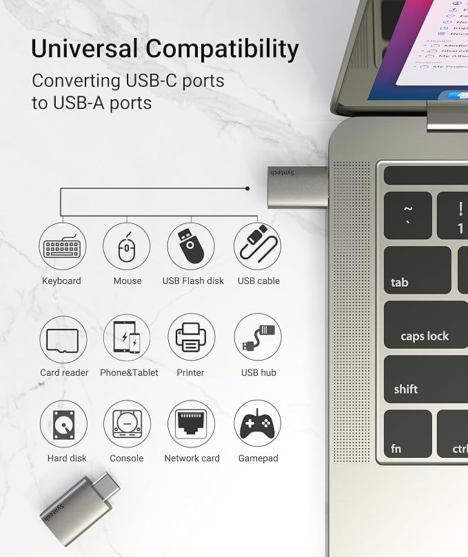 - USB C to USB 3.2 Adapter: Syntech adapter converts USB C port devices to USB A ports and then connects other standard USB A devices. Enables data transfer and charging function between USB A peripherals and devices equipped with USB C ports.