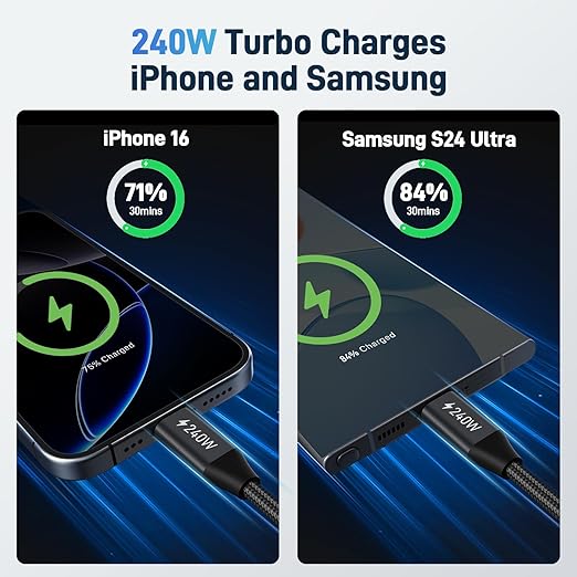 - ใPower All Your DevicesใThis 240W usb c cable backward compatible with 140W/ 100W/ 65W/ 60W/ 45W/ 20W devices. Ideal for fast charging high-performance devices such as laptops, tablets, and smartphones. ๐๐๐๐๐ญ๐ ๐ญ๐ซ๐๐ง๐ฌ๐๐๐ซ ๐ซ๐๐ญ๐ ๐จ๐ง๐ฅ๐ฒ ๐๐๐๐๐๐ฉ๐ฌ.