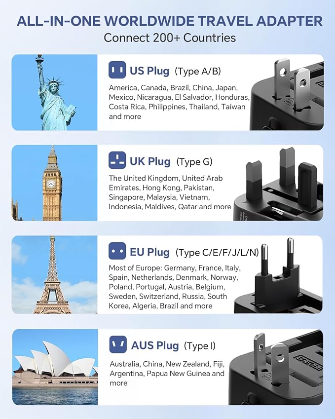 - Worldwide All-in-one Adapter - Travel adapter is equipped with 4 different plug types that could plug into the sockets of 200+ countries and regions: Type C (most popular type) for use in most of Europe, including France, Germany, Italy, Spain, Iceland, Greece, and many other countries; Type G for UK, Ireland, HK, Malaysia, Singapore; Type I for China, Australia, New Zealand, Argentina; Type A for USA, Mexico, Canada, and Japan.