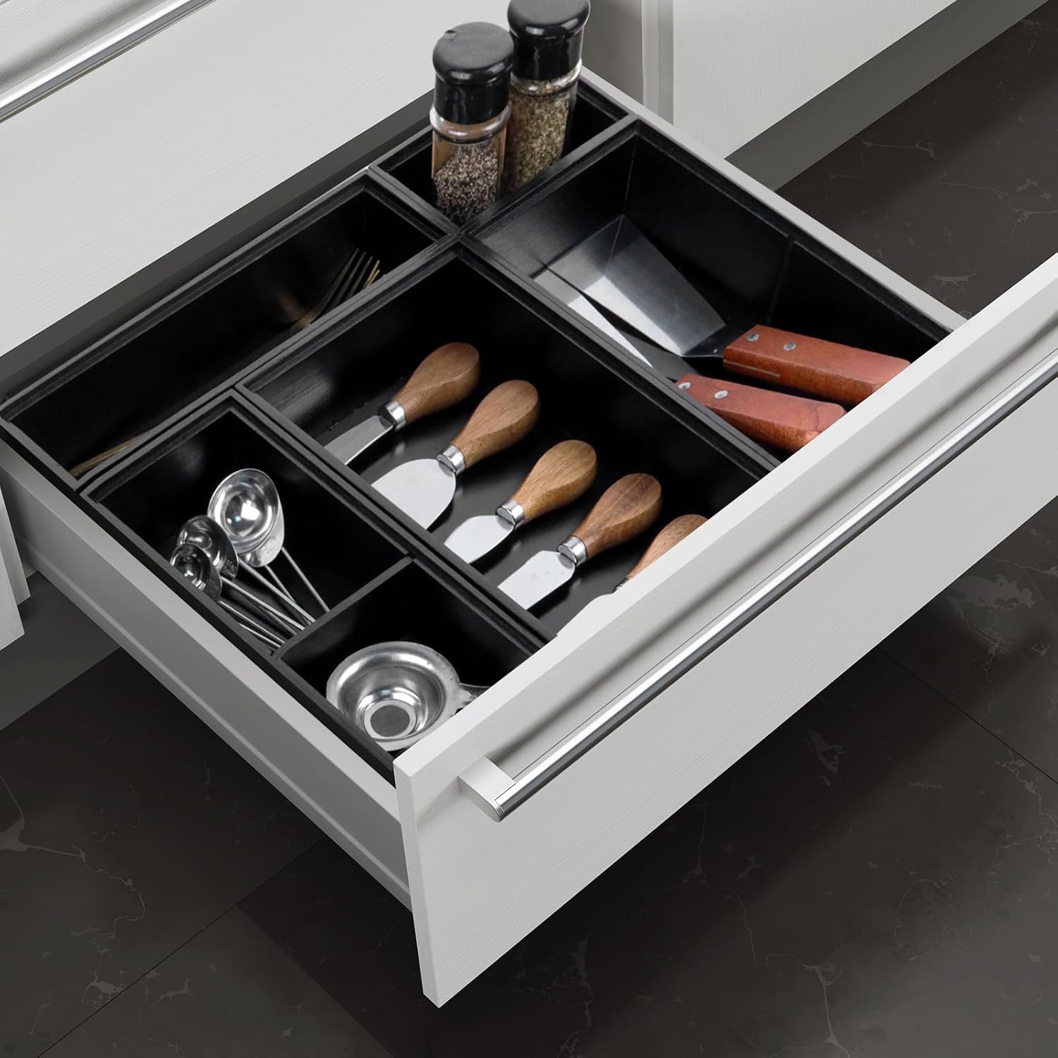 - 【Stackable and with dividers Storage Organizers】The utensil drawer organizer can be stacked to help you save space, and the small dividers in five of the individual storage boxes can be removed at will, so you can customize your own storage solutions according to your needs,and make storage as you wish.