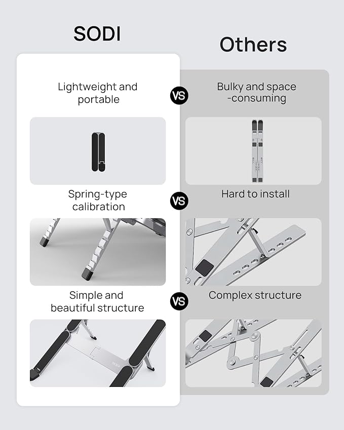 - 【Innovative & Ultra Compact】 The silver SODI 314 laptop stand weighs only 185g (iPhone 16 Pro weighs 199g) and folds up to 12.7*4.4*2cm, making it ultra light and easy to carry in your backpack or pocket for effortless mobility. Perfect for business trip, daily travel, library, cafes work, etc.