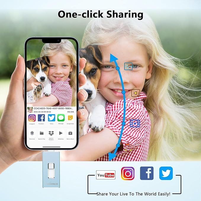 - 🚀【One Click Backup USB Flash Drive Memory Stick - High Speed Transmission, Plug & Play Thumb Drive】Plug and play photo stick for iPhone, enjoy movies or musics stored in the flash drive for iPhone photo stick when you are on trip. Just feel free to transfer videos and photos from iPhone/iPad to MacBook/ Windows PC/Laptops. You can share your photos to social media (such as Facebook, twitter) directly from your USB flash drive for iPhone photo stick when you take nice pictures during your trip.