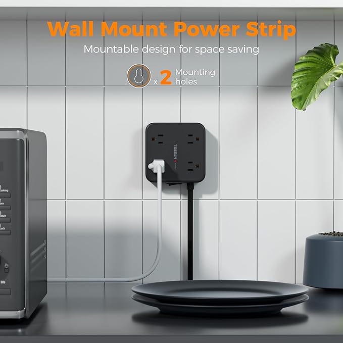 - Mountable Power Strip: 2 mounting holes design allow the extension cord flat wall plug securely installed in various applications, such as wall mounts, floor mounts, under counters and more; 4 rubber feet at the bottom efficiently keep it from slipping and sliding