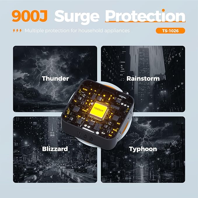 - 900J Surge Protector Outlet: High wattage power strip has On/Off switch can automatically shut off to protect your electronics; Equipped with overload protection, power strips with surge protection provide you with a safe charging environment