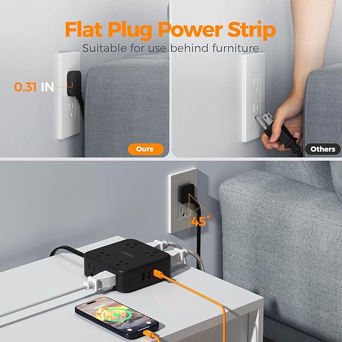 - Easily Flat Plug Power Strip: With only 0.31 inch ultra slim design, this black power strip has a flat plug in real sense; Flat extension cord can fit in tight spaces more easily, hiding behind furniture, beds or refrigerators