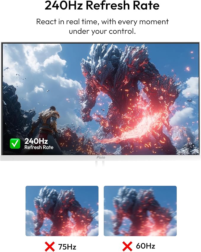 - Experience the future of gaming with the Pixio PX279 Wave White, a high-performance monitor that delivers lightning-fast refresh rates, stunning visuals, and seamless gameplay. Its 27-inch FHD 1080p Fast IPS panel delivers stunning visuals with wide viewing angles and vibrant colors. The blazing-fast 240Hz refresh rate and 1ms GTG response time ensure smooth, tear-free gameplay, while Adaptive Sync technology eliminates screen tearing and stuttering.