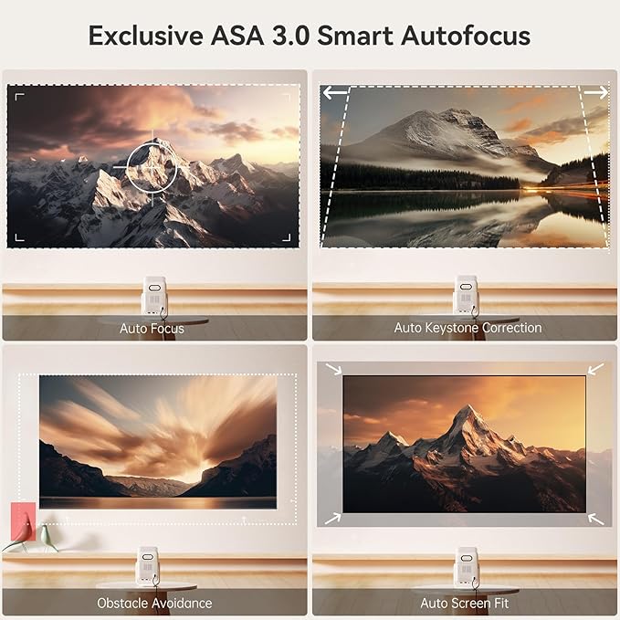 - [Auto Focus, Keystone Correction & 120° Integrated Stand] – Enjoy effortless setup every time. With AI-powered autofocus and gyroscope-based keystone correction, the home projector adjusts automatically within seconds for a crystal-clear image. The 120° rotatable stand offers flexible placement, making projection perfect in any scene without the need for extra equipment.