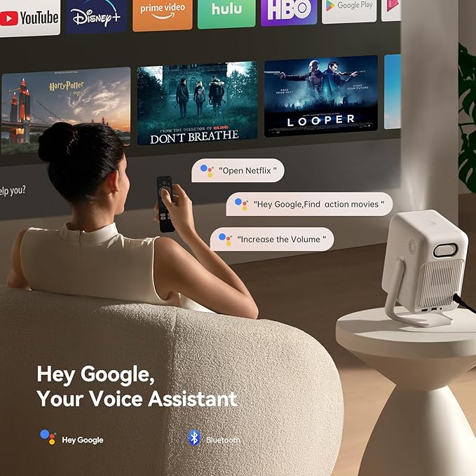 - [Google Voice Control Bluetooth Projector] – Skip the typing—use Google Assistant for voice search to quickly find what you want to watch. Create user profiles, save favorites, and enjoy tailored content. With Google Cast, wirelessly mirror content from Android and iOS.