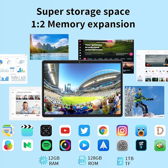- 【Ample storage space】The 10 inch Android tablet with 12(6+6)GB of RAM can run multiple apps at the same time without lag. Users can switch between apps quickly and smoothly. The 128GB internal storage provides plenty of space to store apps, games, photos, videos, music and other files without worrying about running out of space