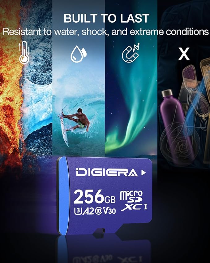 - Professional-Grade Video Recording: Rated C10, V30, and U3, the DIGIERA 256GB microSD card supports smooth 4K UHD video recording with zero interruptions. Itβs perfect for photographers, extreme sports enthusiasts, and travel bloggers, enabling them to capture dynamic shots and manage high-resolution content effortlessly