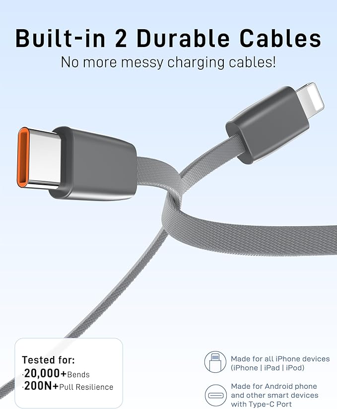 - CHARGE 3 DEVICES SIMULTANEOUSLY: The battery pack for iphone with built in cable features 1 Type-C input/output port, 2 different built-in cables, intelligent allocation of different charging speeds to ensure safety,allowing you to charge up to 3 devices at the same time. Crafted for durability, both built-in cables are tested to endure over 20,000 bends, ensuring it stands up to the rigors of everyday use, adding a touch of elegance to the cell phone battery pack.