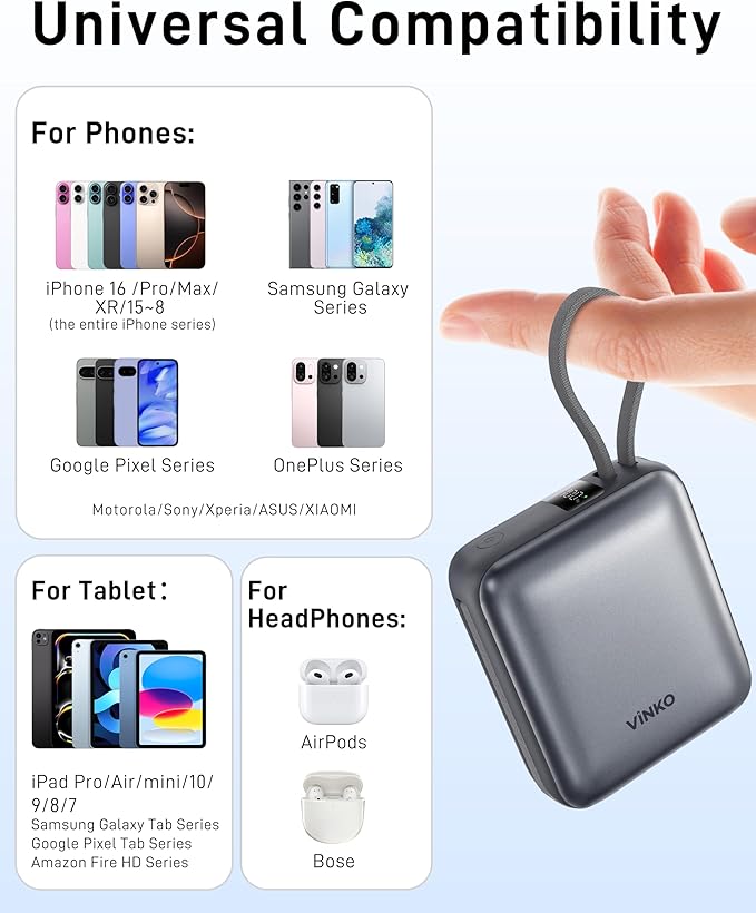 - COMPACT&PORTABLE: This small portable charger power bank measures just 2.9 x 2.5 inches (credit-card size), offering a more compact overall footprint at only 176g. Its thoughtfully thicker build (1 inch) delivers greater capacity and rugged durability, while enhancing grip comfort. With a built-in cable and sleek design, this travel essentials battery pack slips effortlessly into any pocket,Perfect for daily commutes, travel, or outdoor adventures,quickly powers up your phone.