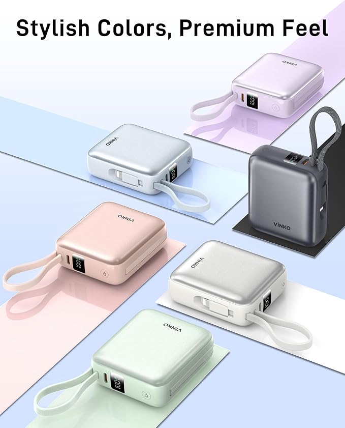VINKO Small Portable Charger, 22.5W Fast Charging Mini Power Bank 10000mAh with Built-in Cables LED Display, Travel Essential USB-C Battery Pack Compatible with iPhone,Samsung,Android (Gray)