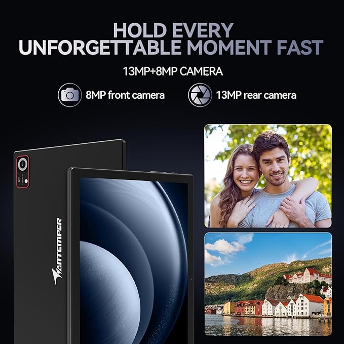 - 【10.1-inch IPS large Screen 1080FHD Video Support 】ANTEMPER Tablet 10-inch IPS large screen allows you to view 1080p full HD movies and videos on YouTube, you can also listen to the details of each video through the dual speakers so that you can immerse yourself in the amazing audio-visual feast. ANTEMPER tablet with pen has built-in eye care modes, and dark modes, which can effectively Adjust the screen mode to effectively filter harmful light and reduce eye fatigue. The tablet also features a crisp 5MP front camera and 8MP rear camera for your daily needs, providing you great photos and clear video chats.