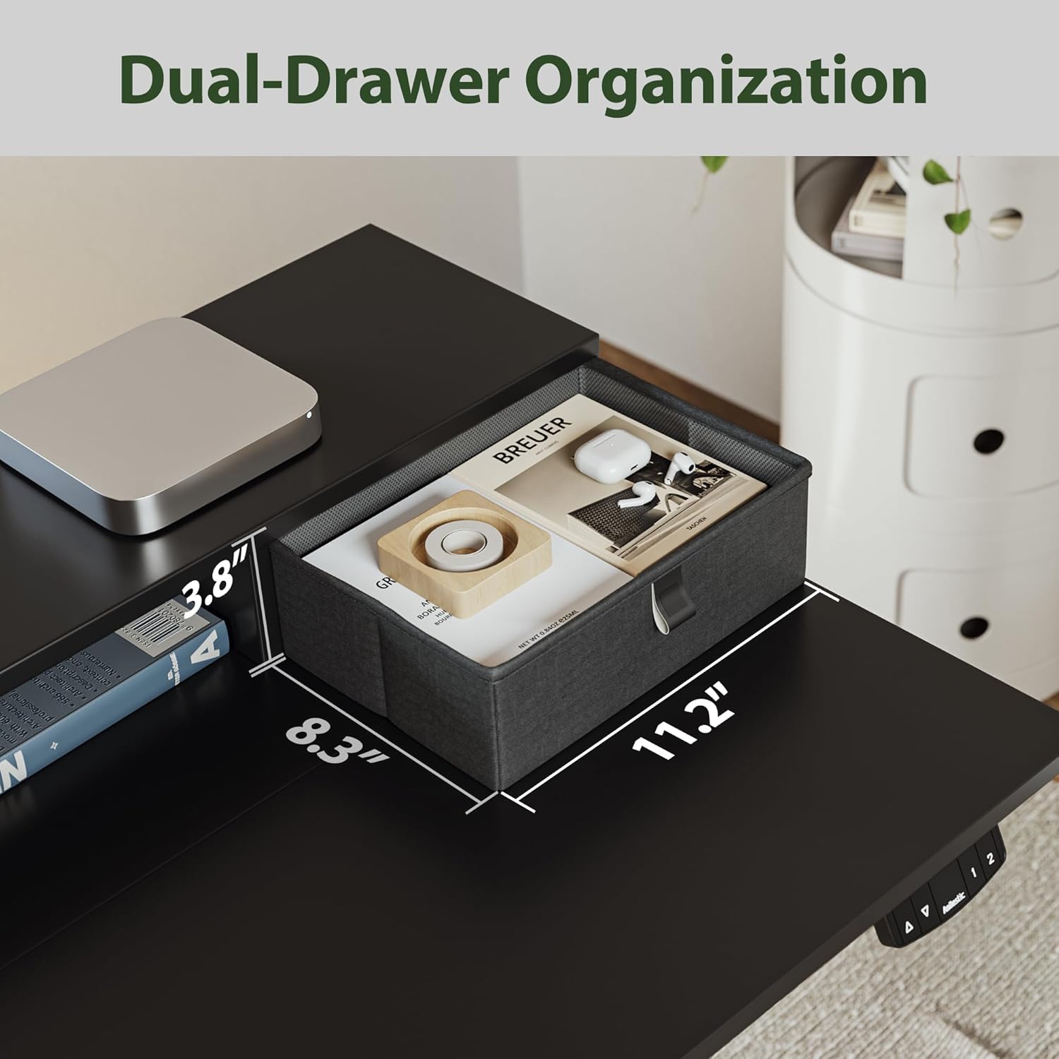 - 【Keyboard Tray & 2 Fabric Drawers】Keep your workspace organized with 2 fabric drawers above the desktop, perfect for storing essentials. The slide-out keyboard tray enhances ergonomic use of your keyboard and mouse. The tabletop is made from low-VOC materials, meeting both federal and state air quality standards.