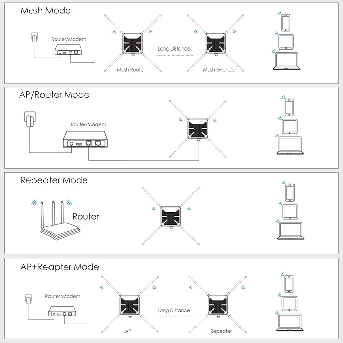 - Flexible Mode Selection: AP/Repeater/Router mode, connects to most wireless signals, including Starlink. Mesh mode allows seamless home roaming with a single SSID/password setup, pairs easily with one touch. Also compatible with Wavlink AC controller for unified management in large networks