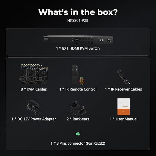 - KVM Switch With Remote Control: This functional 8 port HDMI KVM switch comes with a remote control for your convenience and 8 pcs of dedicated 5ft KVM cables to save you time and money