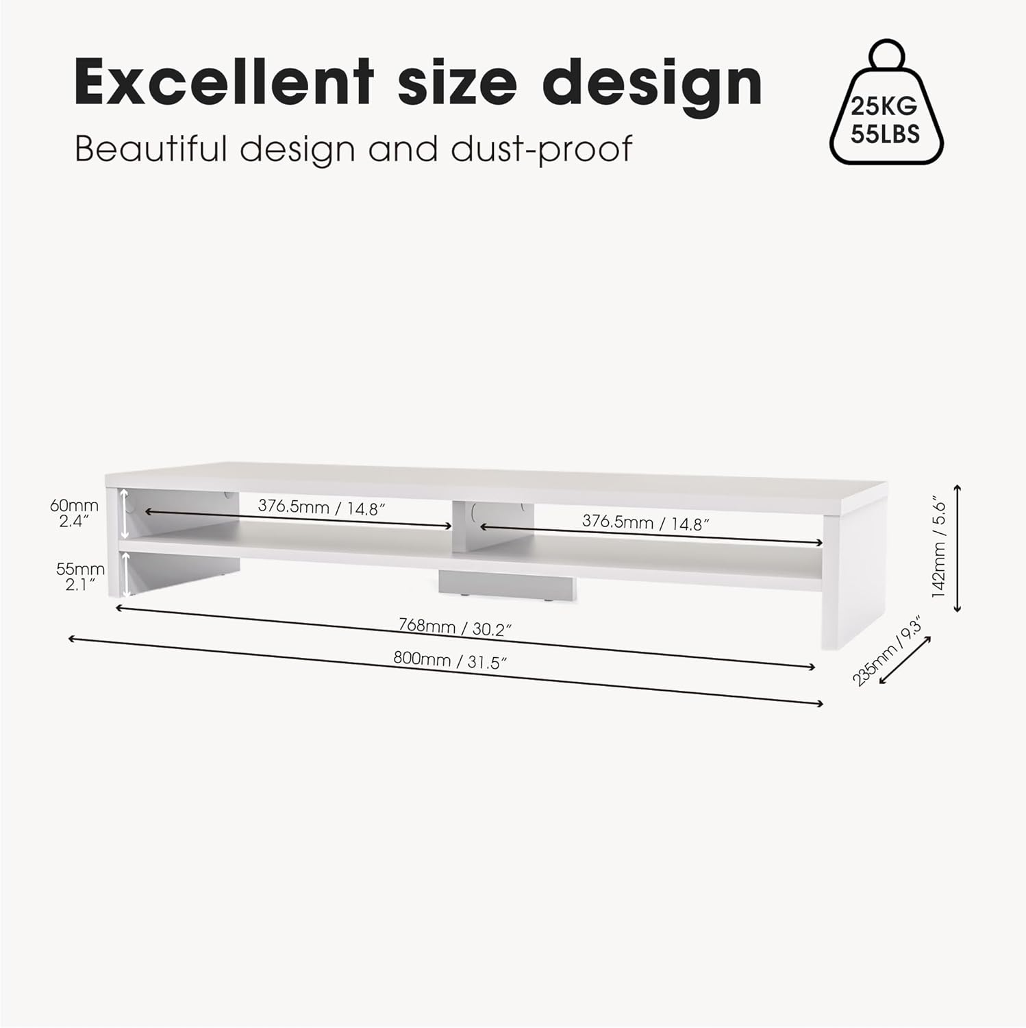 - 【Desk Shelf Organizer】Dimensions: 31.5"x 9.3"x 5.6", designed for monitor setups, this dual monitor stand features 2-tier structure and 2 open compartments to manage cables. Tame your desk chaos: store notebooks, pads, and even a mini plant!