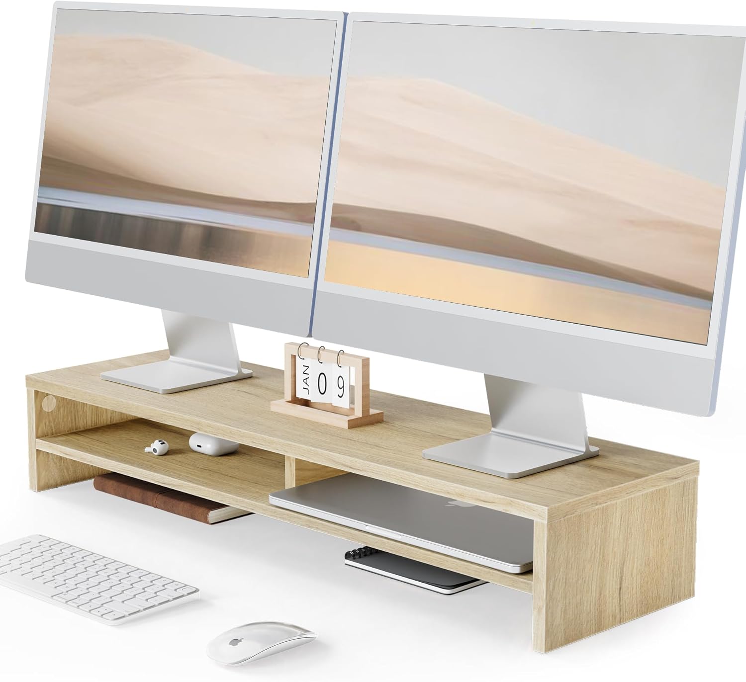 Fenge Monitor Stand, 31.5 Inch Computer Monitor Riser for Desk, 2 Tiers Wood Desk Shelf with Storage, Desktop Organizer for PC, Laptop, Screen, Printer
