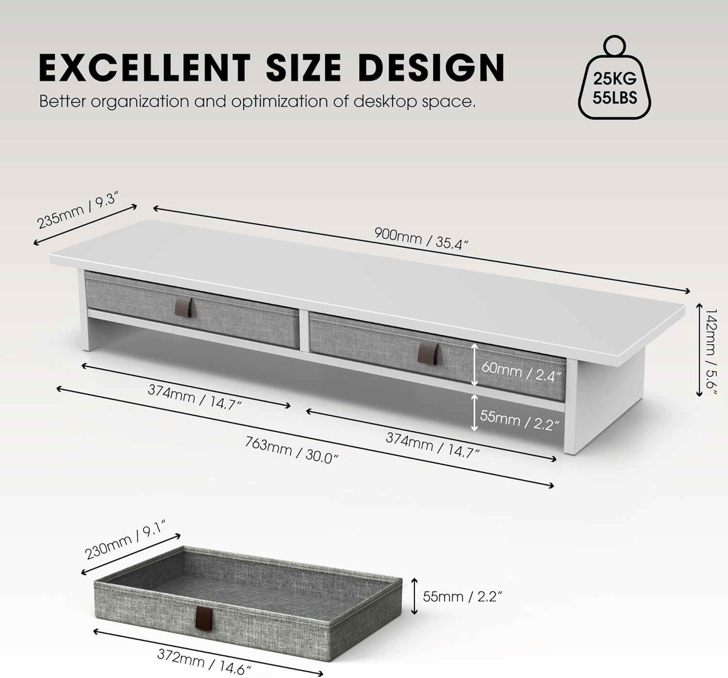 - 【Extra Large Workstation】Equipped with 2 fabric drawers, this monitor stand effortlessly organizes cables, stationery, or office supplies, maximizing desk space while protecting privacy. The 2-tiers structure (35"x9.3") securely holds dual monitors, printers, or TVs, transforming cluttered desks into streamlined workstations.