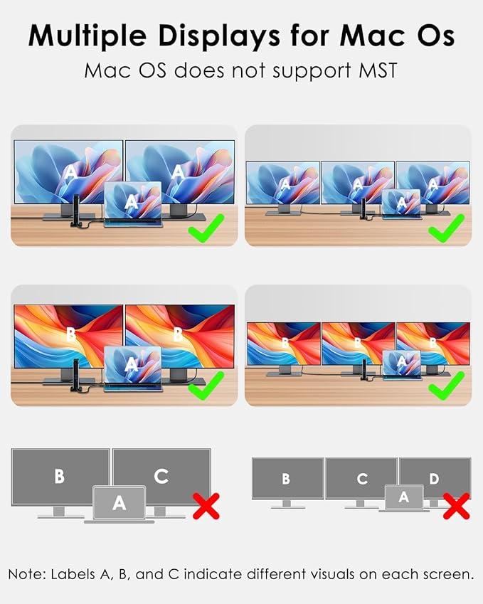 - 【Note Before Purchase】Simply Plug & Play, no external drivers required. MacOS-based computers do not support MST, only extend to one different screen (ABBB). Some Windows laptops may only support 3 monitors(including the host screen) due to their graphic card limitations. Your USB-C phones/tablets should support the OTG function. The type-C port of your host should support video output to enjoy the full function of this docking station. It is only compatible with MacBook models from 2018 and later