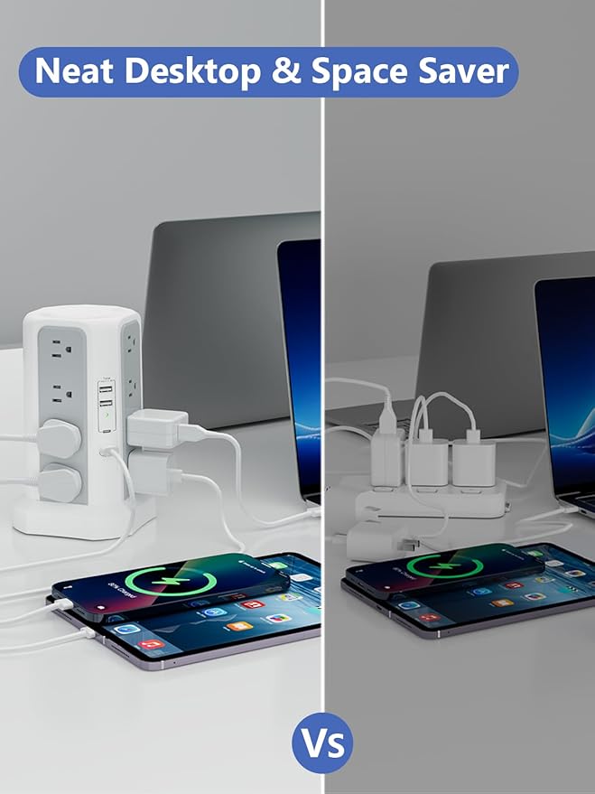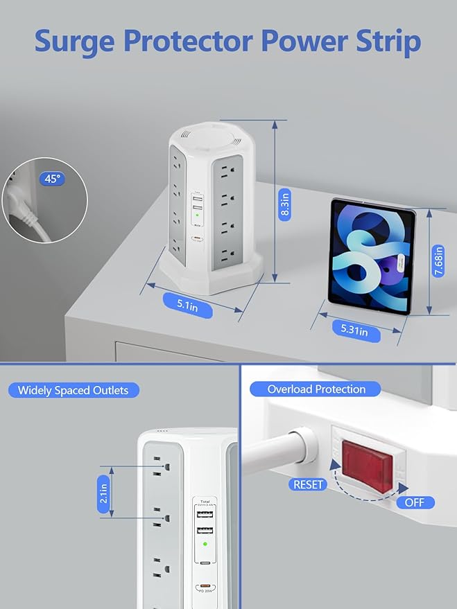 - Surge Protector Extension Cord Tower: Equipped with overload and short-circuit protection, over-current protection and etc; When the usb power outlet power is overloaded, plug strip on/off switch will automatically trip, effectively avoiding short circuits, Keep your device safe and reliable charging.