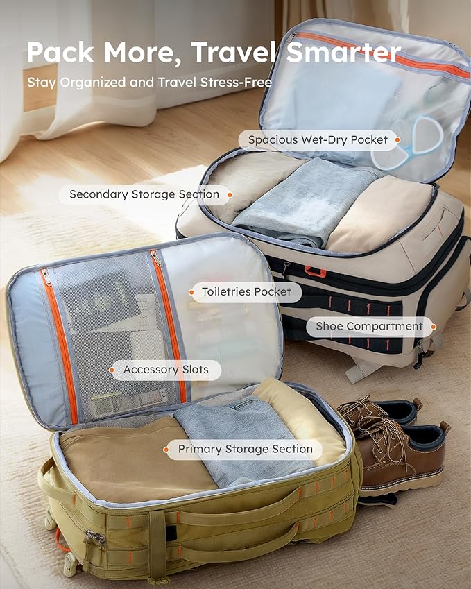- ✅【 Smart Expandable Design & Easy Access】The personal item backpack is perfect for trips up to 5 days with dual-compartment main storage, keeping your gear organized. Expand the 40L travel backpack to 50L for extra souvenirs or compress with straps to save space. The top opening offers quick access to jackets, snacks, or travel documents—perfect for life on the go!