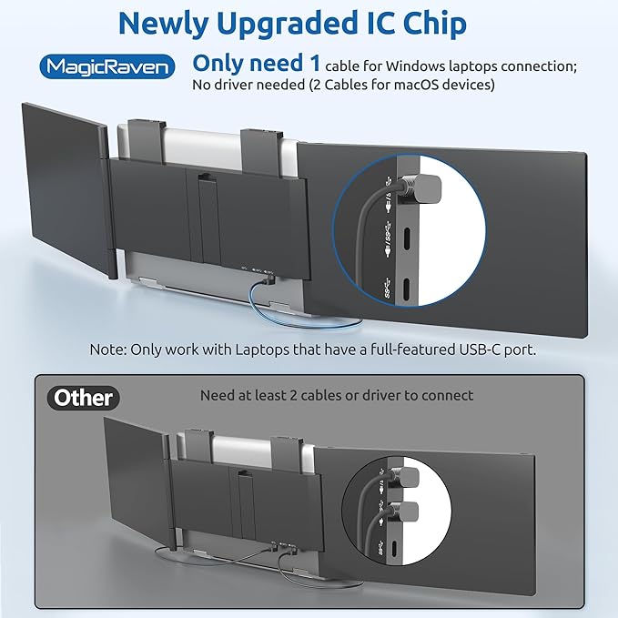 - 【1 Cable Connect, Plug & Play】: 1 USB-C cable connection for Windows laptop and 2 cables connection for macOS laptop. No driver or APP need. True plug-and-play! MagicRaven Triple monitor provides you with perfect multi-screen real-time display and multi-screen independent display solutions. Ideal for easy on-the-go travel dual-monitor setups. Note: It will only extend 1 display when you connect macOS devices with M1,M2,M3,M4 chips. It fits most 14"-16.5" laptops, but can't it fit 13-13.9" or 16.5"+ laptops