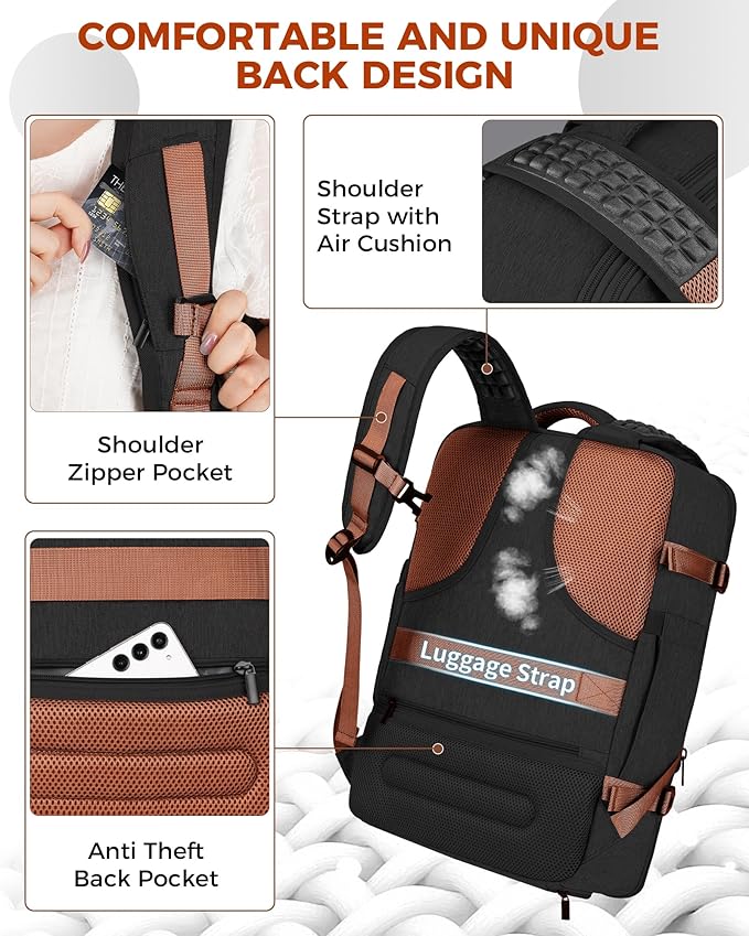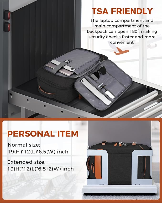 - Spacious and Expandable: This travel backpack for women carry on measures 19 x 13 x 6.5 inches and can expand by 2 inches, weighing just 2.59 pounds. With a 40L capacity, it's great for 3-5 day trips, and the padded shoulder straps ease shoulder pressure during long travels. It also features a zippered pocket on the left strap for coins or cards. The TSA-friendly design opens 90-180 degrees for easy airport security and fits in overhead bins