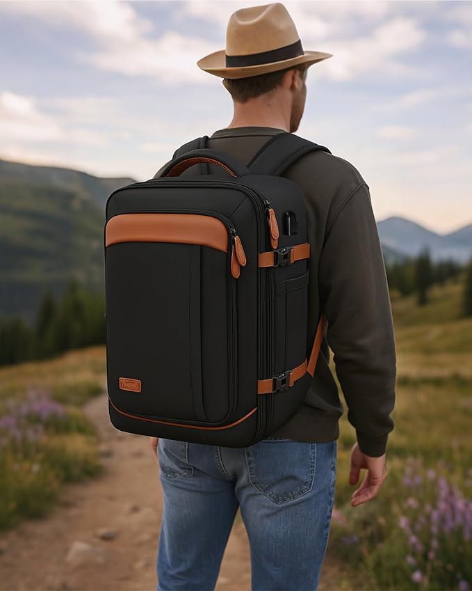Vancropak 40L Travel Backpack for Women & Men, Large Expandable Carry on Backpack for Airplanes with 3 Packing Cubes, Airline Approved Water Resistant Anti Theft Travel Bag fit 17" Laptop, Black Brown